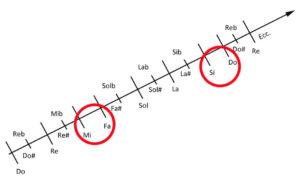 Da notare che non sempre, tra una nota naturale e l’altra, c’è una nota intermedia: in particolare notiamo che questo capita tra il mi e il fa e poi tra il si e il do, dove, appunto, non ci sono note intermedie. Il mi# coincide con la nota fa, così come il fab coincide con la nota mi.